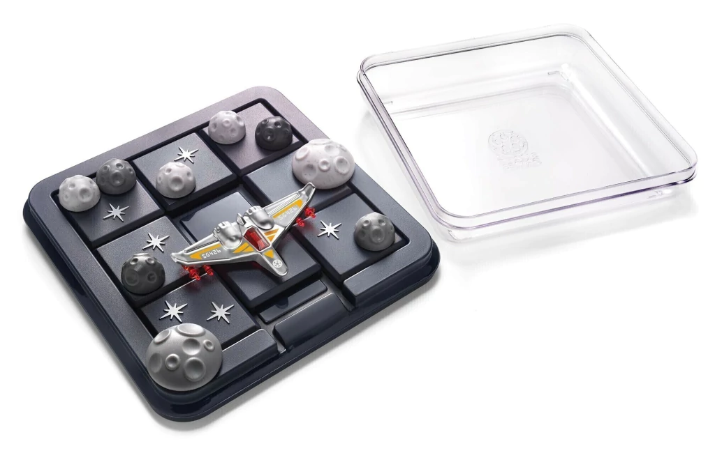 Contém: 1 Tabuleiro de jogo portátil com tampa - perfeito para viagens, 1 nave espacial, 7 peças de quebra-cabeça com asteroides, livreto com 60 desafios e soluções