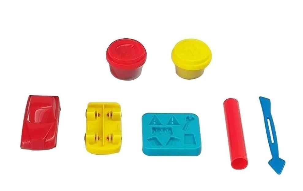 Contém: 2 Potinhos de massinha colorida, 1 carrinho, 1 molde de acessórios, 1 rolo para massinha, 1 espátula, 1 folha de adesivos (Carro) e 1 adesivo (Rolo para massinha)