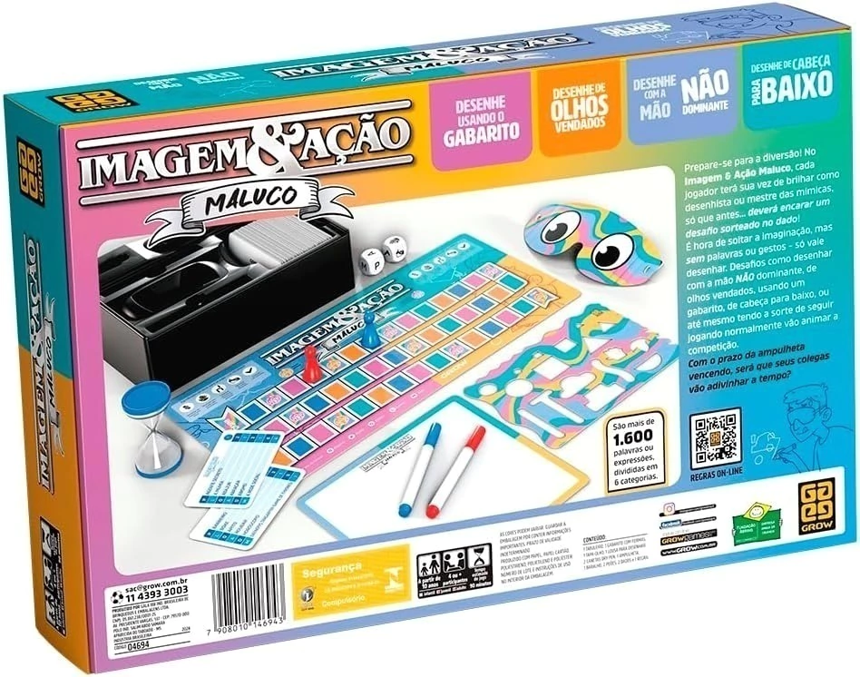 Contém: 1 Tabuleiro, 1 Gabarito com formas, 1 Tapa- olho, 1 Lousa para desenhar, 2 Canetas dry pen, 1 Ampulheta, 1 Baralho, 2 Peões, 2 Dados e 1 Regra